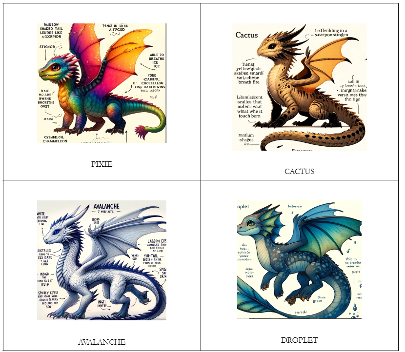 We started by generating images for her characters. Armed with names and descriptions, we turned to Dall-E to create images. During the final week of school, we sat for a couple of hours in a local coffee shop and tweaked visual representations of each dragon: the dragonet crew.